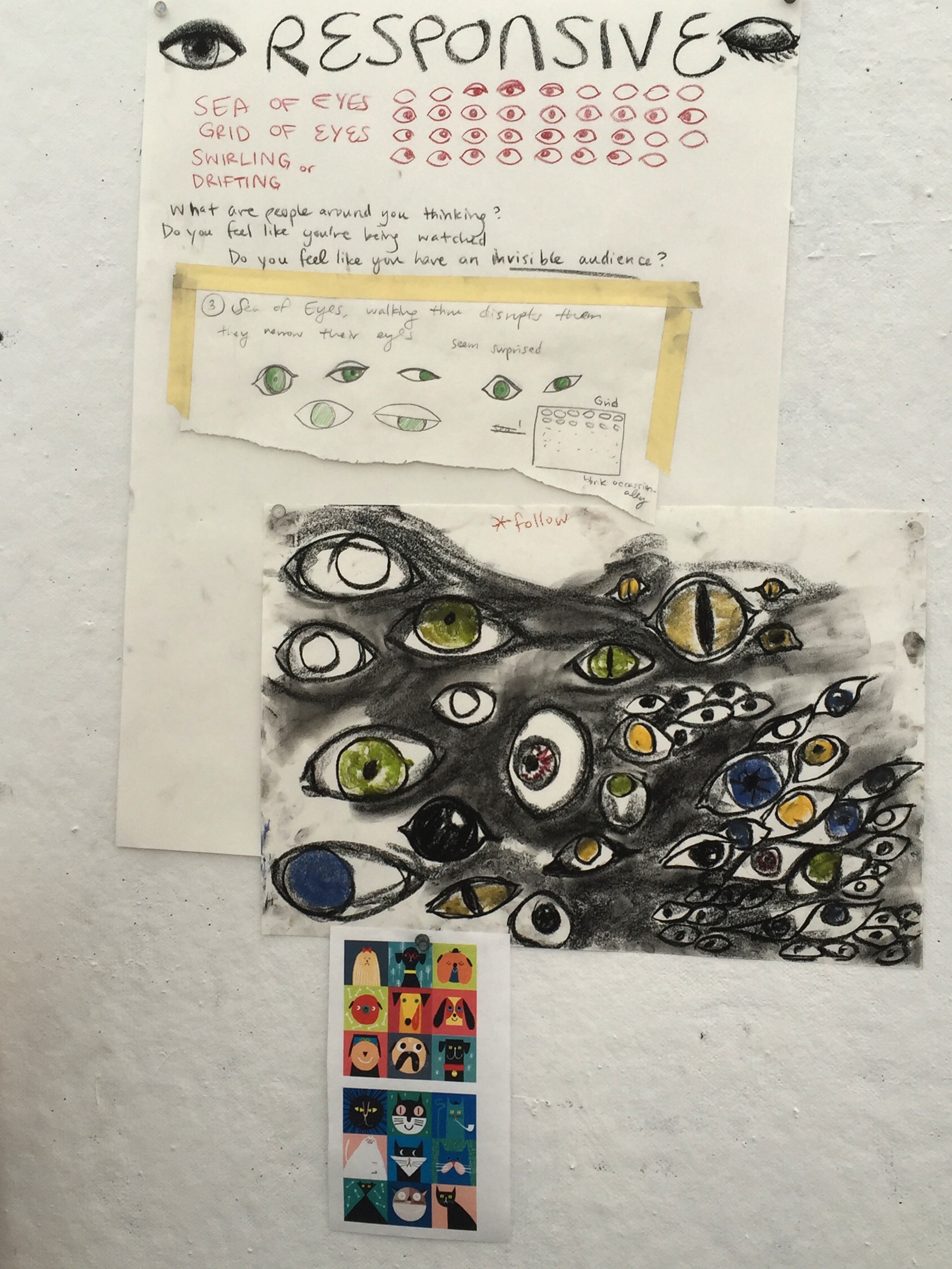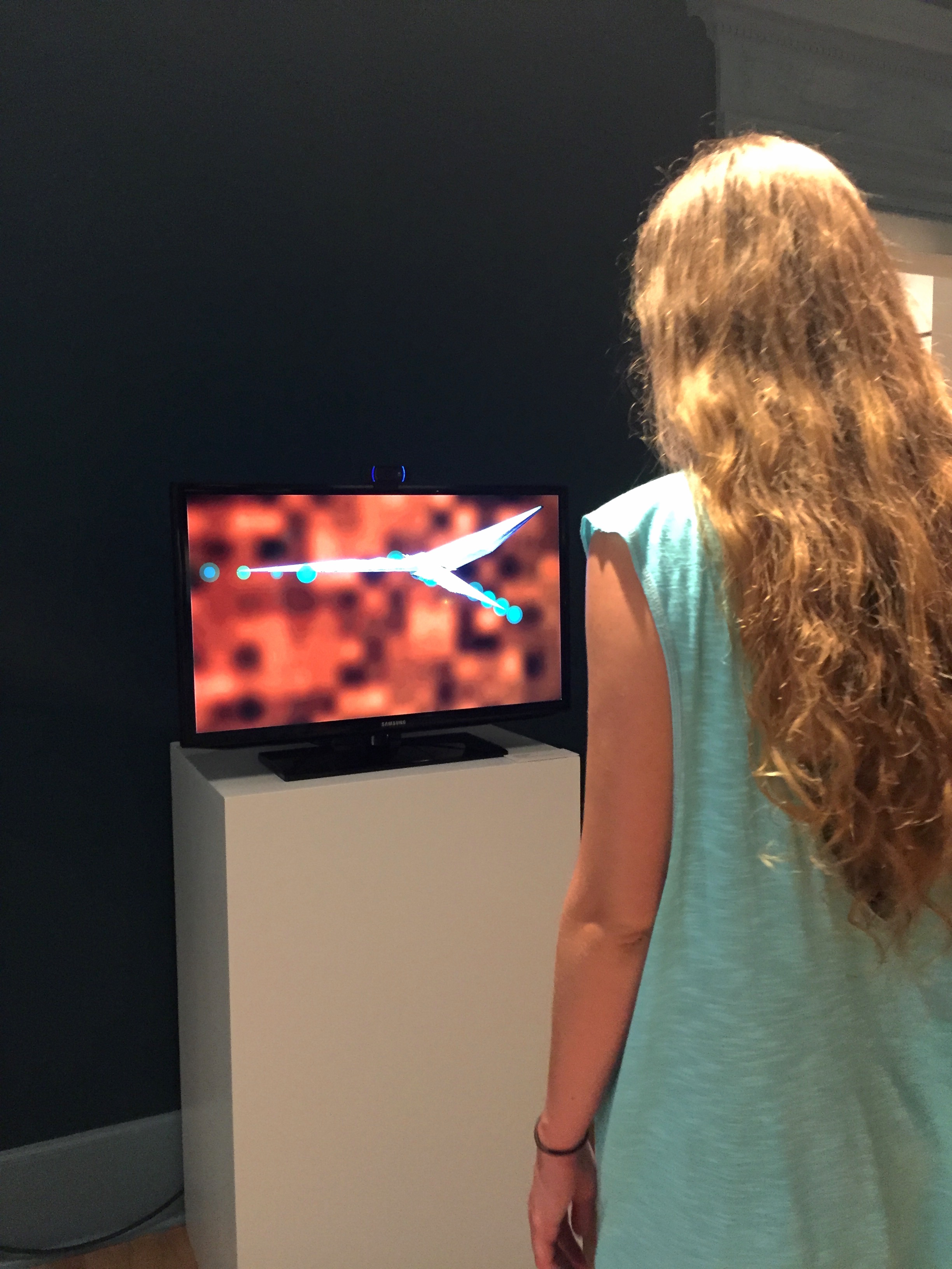 Working out the facial recognition and tracking was an iterative process. I also experimented with reactive pattern-making, and using different abstract shapes and colors. Throughout the process, I was increasingly drawn to the overlapping shapes and the assertive, sharp edges of the triangles. As people move laterally through the space in front of the screen, the long, blade-like triangles lance across the screen towards found faces (denoted by the green circles in the final piece).